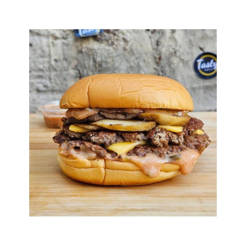 280 gr smash burger, 72 gr de Proteína, 631 cal, champiñon, doble queso cheddar reducido en kcal, salsa tasty protein light, pan de papa. (72 gr Pr, 39 gr Carb, 20 gr Gr - 631 cal).